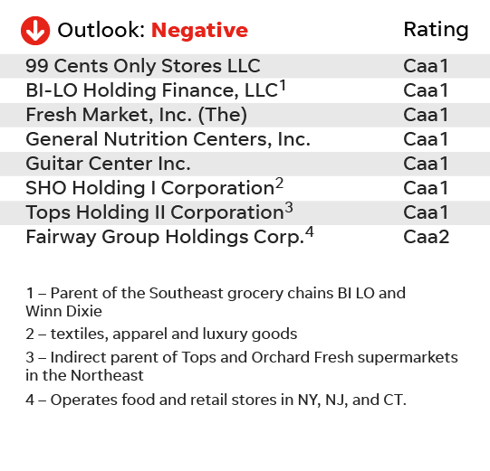 Low ratings reflect heavy debt loads and low amounts of available cash as retail chains struggle with shoppers shifting from physical stores to online buying.